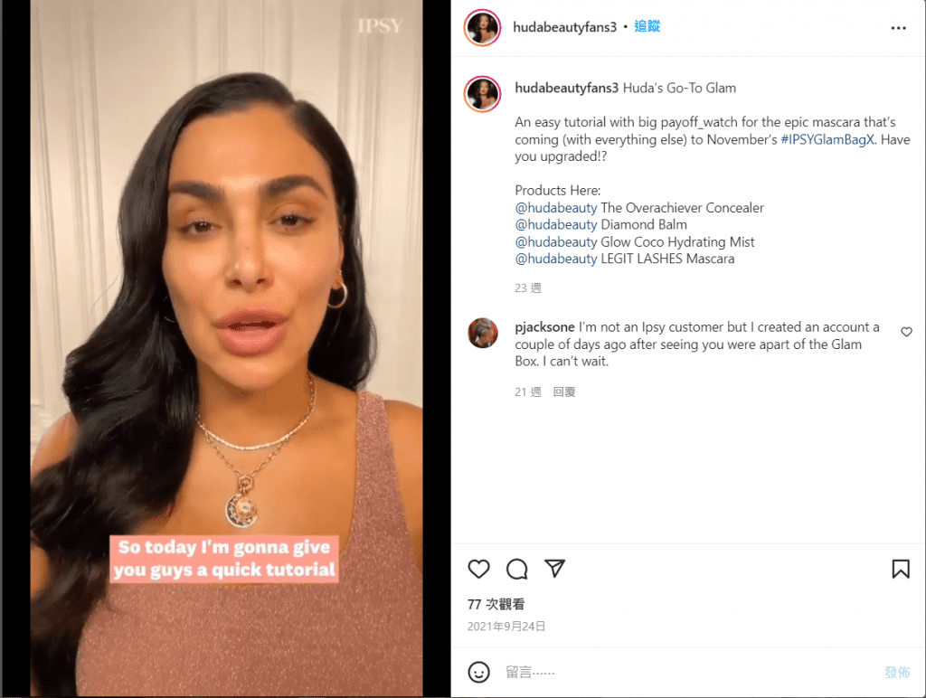(Huda Kattan 經常挑戰她的粉絲使用 Huda Beauty 產品打造主題妝容,然後在她的 Instagram 個人資料上分享了這些粉絲視頻。 圖片來源: Instagram# hudabeautyfans3)